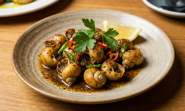 Spicy and savory peppered snail, perfect as a starter.